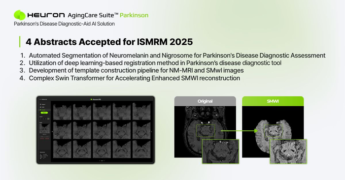 ISMRM는 매년 의료진·연구자 수백명이 참여하는 자기공명영상(MRI) 분야 권위 있는 학회다. 휴런은 ISMRM 2025에서 MRI를 활용한 파킨슨병 관련 연구 초록 총 4편을 발표한다. 파킨슨병 진단 평가를 위한 뉴로멜라닌과 나이그로좀 자동분석, 파킨슨병 진단 도구에서 딥러닝 기반 정합법 활용, 뉴로멜라닌 감응(NM)-자회율맵 강조 영상(SMWI) 템플릿 구축 파이프라인 개발, 복합 스윈 트랜스포머를 이용한 향상된 SMWI 재구성 가속 연구 등을 공유한다.