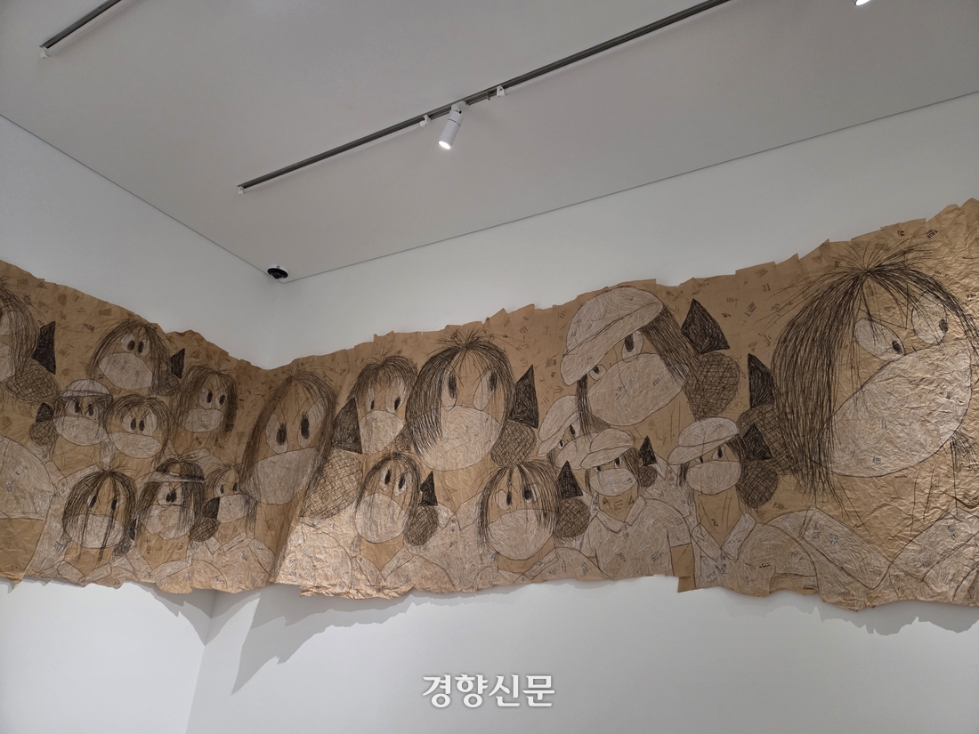 그의 예전 삶의 터전이자 작품의 주된 대상은 아르바이트 노동자다. 그는 대학생 때부터 약 10년간 외국계 대형 프랜차이즈 카페나 패스트푸드점에서 일하던 경험을 작품으로 표현해 왔다. 아트바젤 홍콩에서 선을 보였고, 지난달 12일부터 서울 용산구 P21갤러리의 전시 ‘으웩! 음식에서 머리카락!’ 공간을 가득 채우고 있는 ‘유주얼 서스펙트’ 연작도 그렇다. 흙빛 종이에 그려진 둥근 얼굴들은 머리망으로 머리를 묶고 흰 마스크를 쓴 채 둥근 눈을 이리저리 굴린다. 그림 배경이나 조각의 주된 색이 흙빛인 건, 그가 패스트푸드점에서 일할 때 퇴근 후 챙긴 감자튀김 포대를 사용해 초창기 작업을 했기 때문이다.