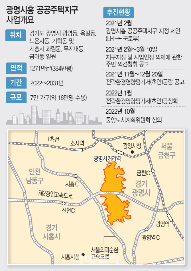 광명·시흥 지구는 2021년 2월 공공주택 지구로 발표됐고 이듬해인 2022년 11월 공공주택 지구로 지정되면서 3기 신도시 조성이 본격화했다. 당시만 해도 2024년 토지 보상이 이뤄지고 2025년 공사가 착공될 예정이었으나 이러한 일정이 지연되고 있다.