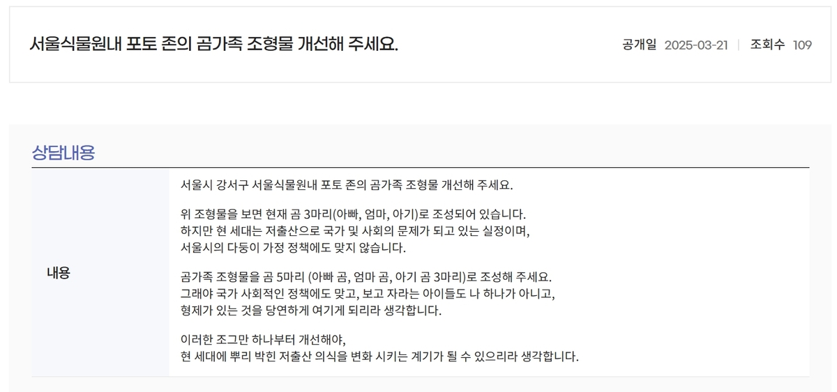 7일 서울시와 서울식물원 등에 따르면 민원인 A씨는 지난 3월 ‘식물원의 곰 가족 조형물은 서울시의 다둥이 정책과 맞지 않는다’는 취지 민원을 제기했다.
