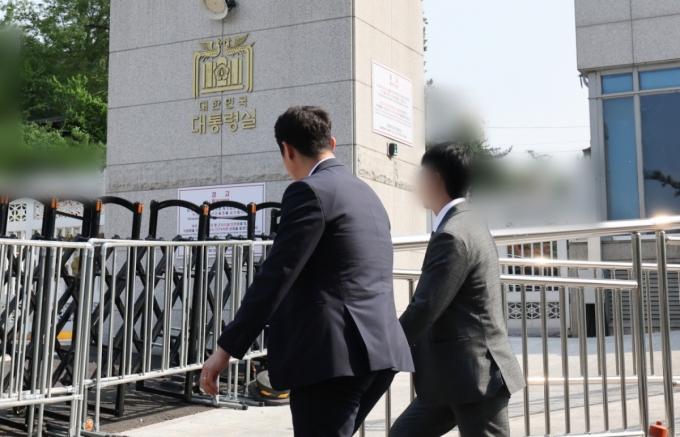 해병대원 순직사건 수사외압 의혹을 수사 중인 고위공직자범죄수사처(공수처) 수사관들이 대통령비서실과 국가안보실에 대한 압수수색을 시도하기 위해 7일 서울 용산구 대통령실 민원실 출입구로 들어서고 있다. /사진=뉴스1 |