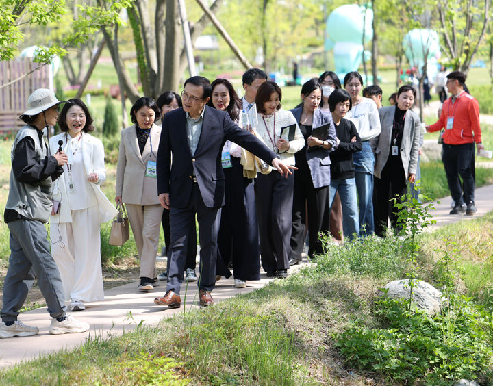 [수원=뉴시스] '숲과 쉼이 있는 행복 발견 여행' 연수 프로그램이 진행된 7일 오후 경기 수원시 영흥수목원을 찾은 임태희 경기도교육감이 부서 관계자들과 함께 시설을 둘러보며 교사의 교육활동 및 정신건강을 보호하기 위한 방안을 모색하고 있다. (사진=경기도교육청 제공) 2025.05.07. photo@newsis.com *재판매 및 DB 금지 |