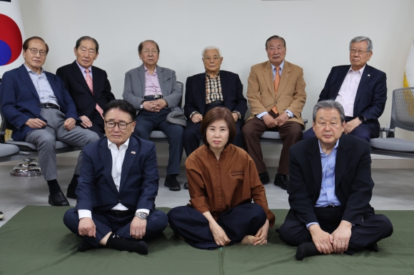 김무성 전 새누리당(국민의힘 전신) 대표를 비롯한 국민의힘 상임고문단과 김미애 의원이 7일 서울 여의도 당사에서 대선후보 단일화를 촉구하며 단식농성을 하고 있다. 앞줄 왼쪽부터 유준상 상임고문, 김미애 의원, 김무성 상임고문. 뒷줄 왼쪽부터 신경식, 김동욱, 김종하, 목요상, 권해옥, 유흥수 고문. 2025.5.7. 국민의힘 제공 |