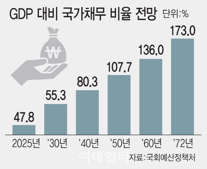 이에 따른 국가채무는 올해 1270조 4000억원에서 2072년 7303조 6000억원으로 6배가량 늘어날 전망이다. GDP 대비 국가 채무 비율은 같은 기간 47.8%에서 173.0%까지 치솟을 것으로 예측된다. 저출생·고령화가 이어지며 국가가 벌어들이는 수입 대비 지출 증가 폭이 더 크게 확대하면서다.