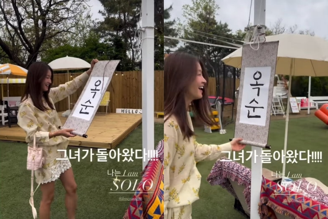 이날 영상 속 이시영은 지인들이 준비한 깜짝이벤트에 웃음을 터트리고 있다. 이시영이 커튼을 열고 앞으로 나가자 '옥순'이라고 적힌 족자가 있다.