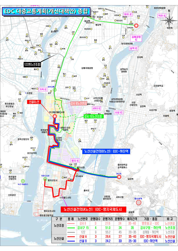 노선은 에코델타시티~명지새동네~국회도서관(28.2㎞) 구간과 에코델타시티~강서경찰서~하단 구간으로 배차 간격은 각각 30~35분, 30분이다.
