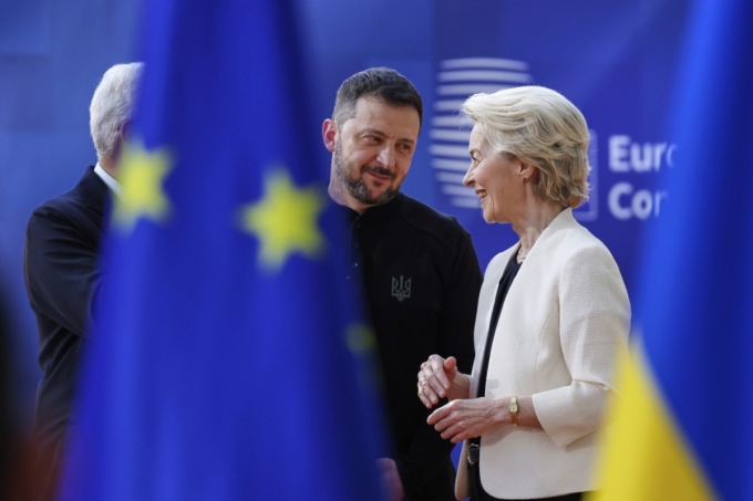 볼로디미르 젤렌스키(가운데) 우크라이나 대통령이 6일(현지 시간) 벨기에 브뤼셀에서 열린 유럽연합(EU) 27개국 특별 정상회의에 참석해 우르줄라 폰데어라이엔 EU 집행위원장과 대화하고 있다. /AP=뉴시스 |
