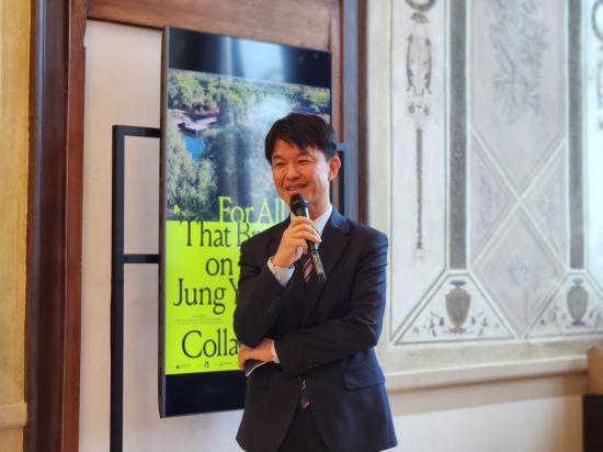 문화체육관광부 용호성 제1차관이 7일(현지시각) 이탈리아 베니스의 산 마르코 아트센터에서 열린 국립현대미술관의 베니스 순회전 ‘이 땅에 숨 쉬는 모든 것을 위하여: 정영선과 협업자들’ 개막식에서 축사를 하고 있다. [사진 제공= 문화체육관광부] |