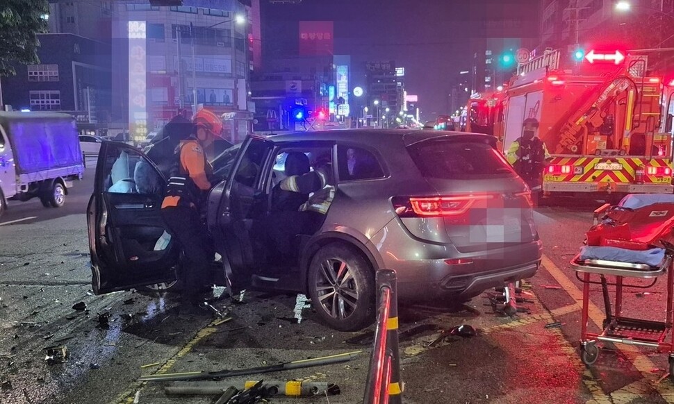 사고 당시 ㄱ씨가 몰던 승용차는 왕복 8차로 도로에서 중앙선을 넘어 역주행하다가 스포츠유틸리티 차량과 충돌했다. ㄱ씨는 앞서 음주운전으로 적발돼 면허 정지를 받은 상태에서 또다시 술을 마시고 무면허 운전을 한 것으로 조사됐다.