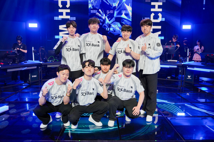 DRX 선수단이 26일 열린 VCT 퍼시픽 스테이지1 플레이오프 승자조 1라운드에서 T1을 꺾고 포즈를 취하고 있다. 사진 | 라이엇 게임즈 |