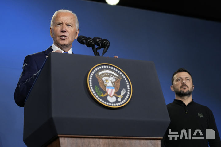 [워싱턴=AP/뉴시스]조 바이든 미 대통령(왼쪽, 당시)이 2024년 7월11일 워싱턴에서 열린 북대서양조약기구(나토) 정상회의와 별도로 열린 '우크라이나 콤팩트' 행사에서 볼로디미르 젤렌스키 우크라이나 대통령이 지켜보는 가운데 연설하고 있다. 바이든은 퇴임 후 첫 인터뷰에서 도널드 트럼프 대통령이 러시아에 영토를 양보하도록 우크라이나에 압력을 가하는 것은 1930년대 나치의 유럽 영토 합병을 막지 못했던 "현대판 유화책"이라며, 파나마, 그린란드, 캐나다 인수에 대한 트럼프의 발언이 유럽에 미국에 대한 불신을 키웠다고 말했다. 2025.05.07. |