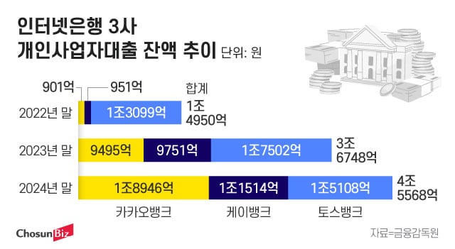 개인 신용대출·주택담보대출 등 가계대출을 늘리기 어려워진 인터넷전문은행이 455조원 규모의 개인사업자 대출 시장으로 눈을 돌리고 있다. 금융 당국의 가계 대출 관리 강화 기조에 성장이 정체됐기 때문인데, 인터넷은행이 편리성과 금리 경쟁력을 무기로 개인사업자 대출 시장에서 ‘메기 효과’를 낼 수 있을지 주목된다.