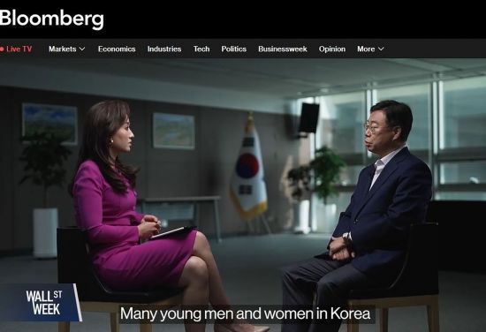 미국 블룸버그TV ‘월스트리트 위크 보도 중 셰리안 앵커와 인터뷰하고 있는 신상진 성남시장 영상 캡처. 성남시 제공 |