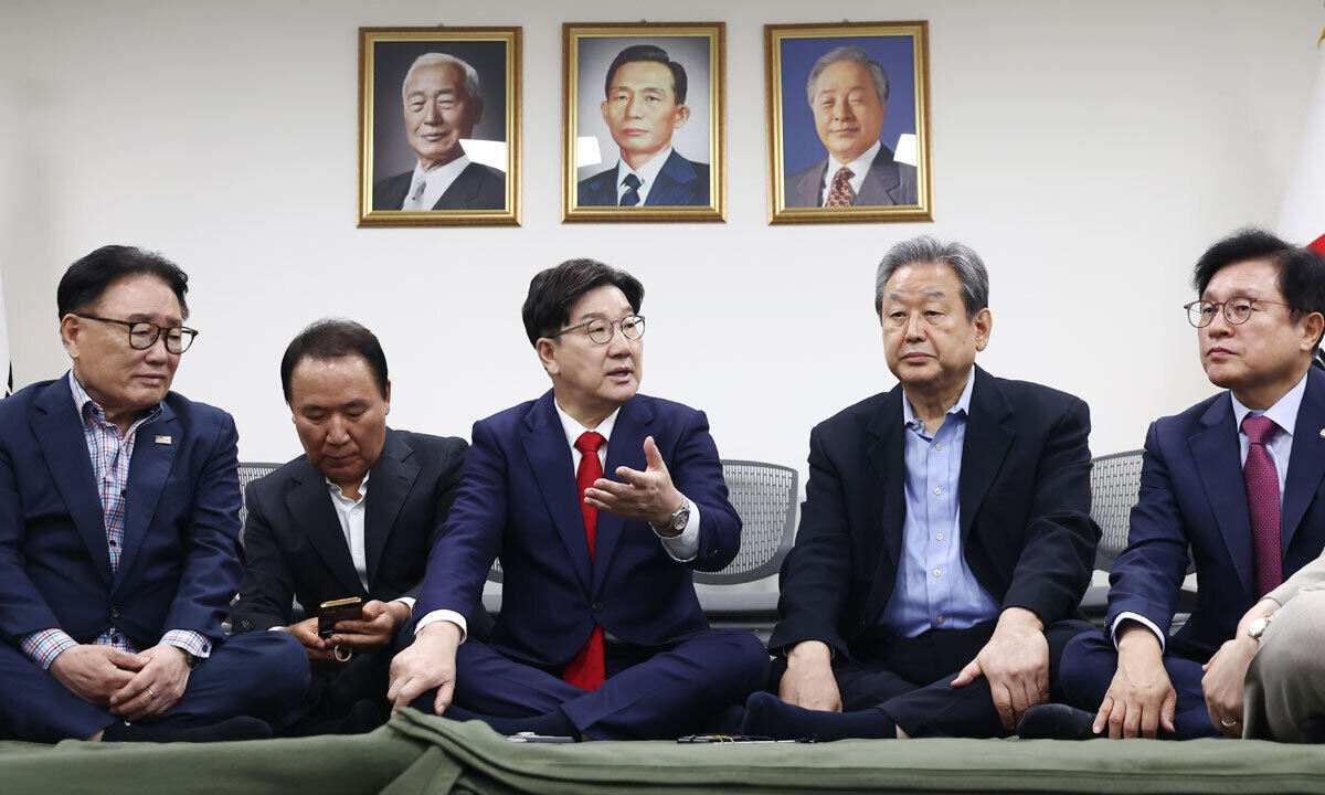 김문수 국민의힘 대통령 후보에게 단일화 약속을 촉구하며 무기한 단식에 돌입한 권성동 원내대표가 8일 오전 서울 여의도 중앙당사에서 같은 이유로 단식 농성에 들어간 김무성(오른쪽 두번째), 류준상 상임고문을 만나고 있다. 뉴스1 |