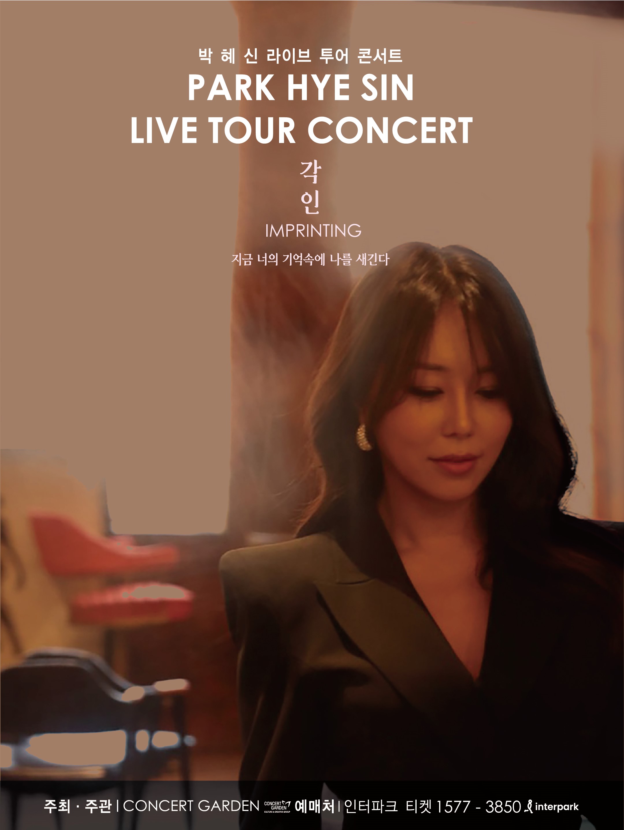 오는 10일 안양아트센터 관악홀에서 첫 무대를 연 뒤, 24일에는 서울 여의도 KBS홀에서 두 번째 콘서트를 이어갈 예정이다. '각인'이라는 앨범 타이틀에 걸맞게 박혜신은 감동적인 무대를 통해 관객들의 기억에 영원히 남을 공연을 예고하고 있다. 서울 공연은 오후 5시에 시작되며 약 120분간 진행될 예정이고, 전 연령층을 아우르는 감성과 연출로 다양한 관객층의 기대를 모으고 있다.