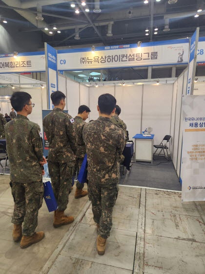 ‘2025 국군장병 취업박람회’에 마련된 뉴욕상하이컨설팅그룹 부스에서 군 장병들을 대상으로 외국계 취업 컨설팅이 진행되고 있다./사진제공=뉴욕상하이컨설팅그룹 |