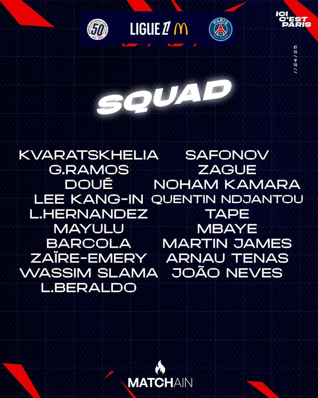 경기를 앞두고 PSG는 몽펠리에 원정 스쿼드를 발표했다. 우스만 뎀벨레, 비티냐, 잔루이지 돈나룸마, 마르퀴뇨스, 아슈라프 하키미 등 지난 유럽축구연맹(UEFA) 챔피언스리그(UCL) 4강 2차전 아스널전에서 체력을 소모한 선수들은 명단 제외됐다. 부분적인 로테이션 가동이다. 흐비차 크바라츠헬리아, 데지레 두에, 브래들리 바르콜라, 주앙 네베스 등 몇몇 주전 선수들은 포함됐다.