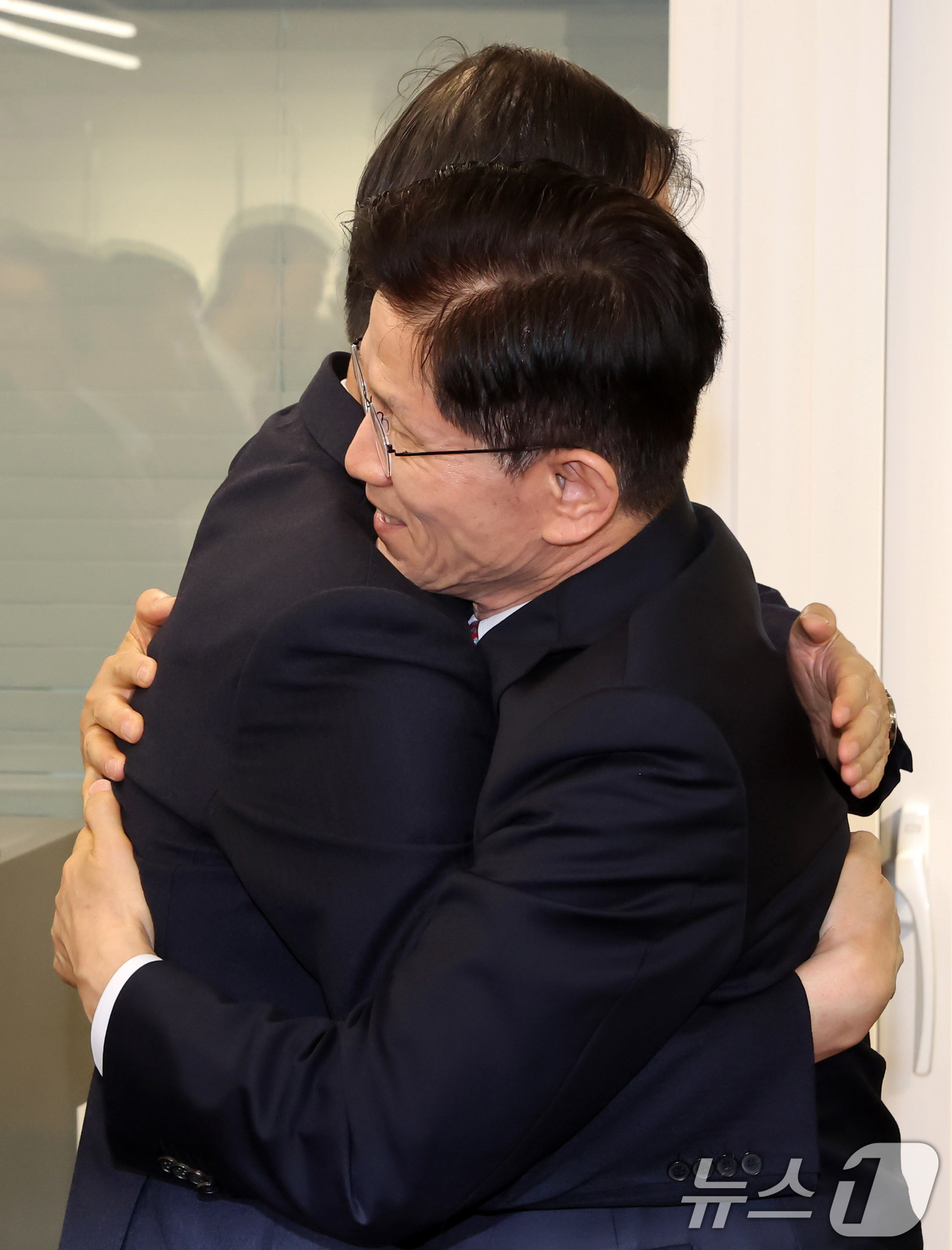 (서울=뉴스1) 이광호 기자 = 김문수 국민의힘 대선후보와 한덕수 전 국무총리가 11일 서울 여의도 국민의힘 대선후보 사무실에서 회동을 마친 뒤, 포옹을 하고 있다. (공동취재) 2025.5.11/뉴스1