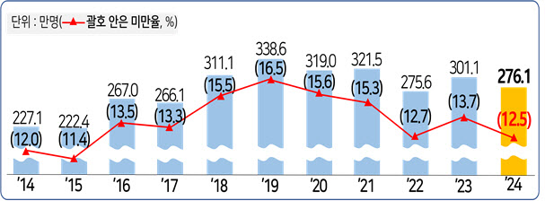 한국경영자총협회(경총)가 통계청 자료를 분석해 11일 발표한 ‘2024년 최저임금 미만율(최저임금을 받지 못한 근로자 비율) 분석 보고서’에 따르면, 2024년 법정 최저임금액인 시급 9860원을 받지 못하는 근로자 수는 276만1000명에 달한 것으로 나타났다. 2001년 57만7000명에서 378.5% 증가한 수치다. 지난해 최저임금 미만율은 2001년(4.3%)의 약 3배 수준인 12.5%로 8.2%포인트나 증가했다.