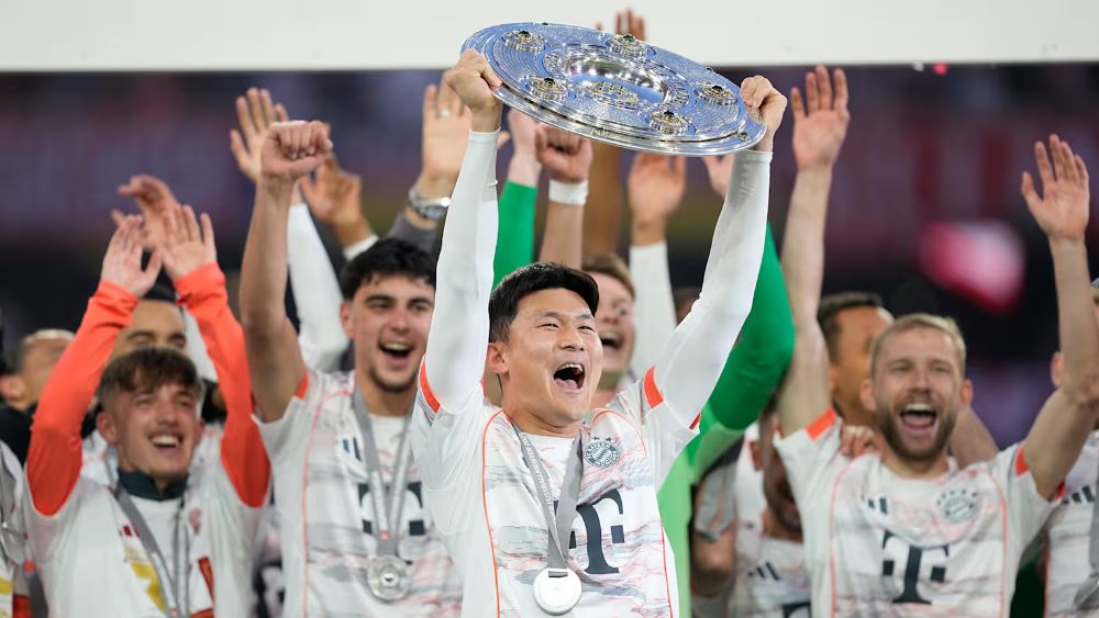 (엑스포츠뉴스 윤준석 기자) 바이에른 뮌헨의 '괴물 수비수' 김민재가 분데스리가 우승을 자축하는 공식 세리머니에서 팀 동료들의 격려를 받으며 우승 트로피를 들어 올렸다.
