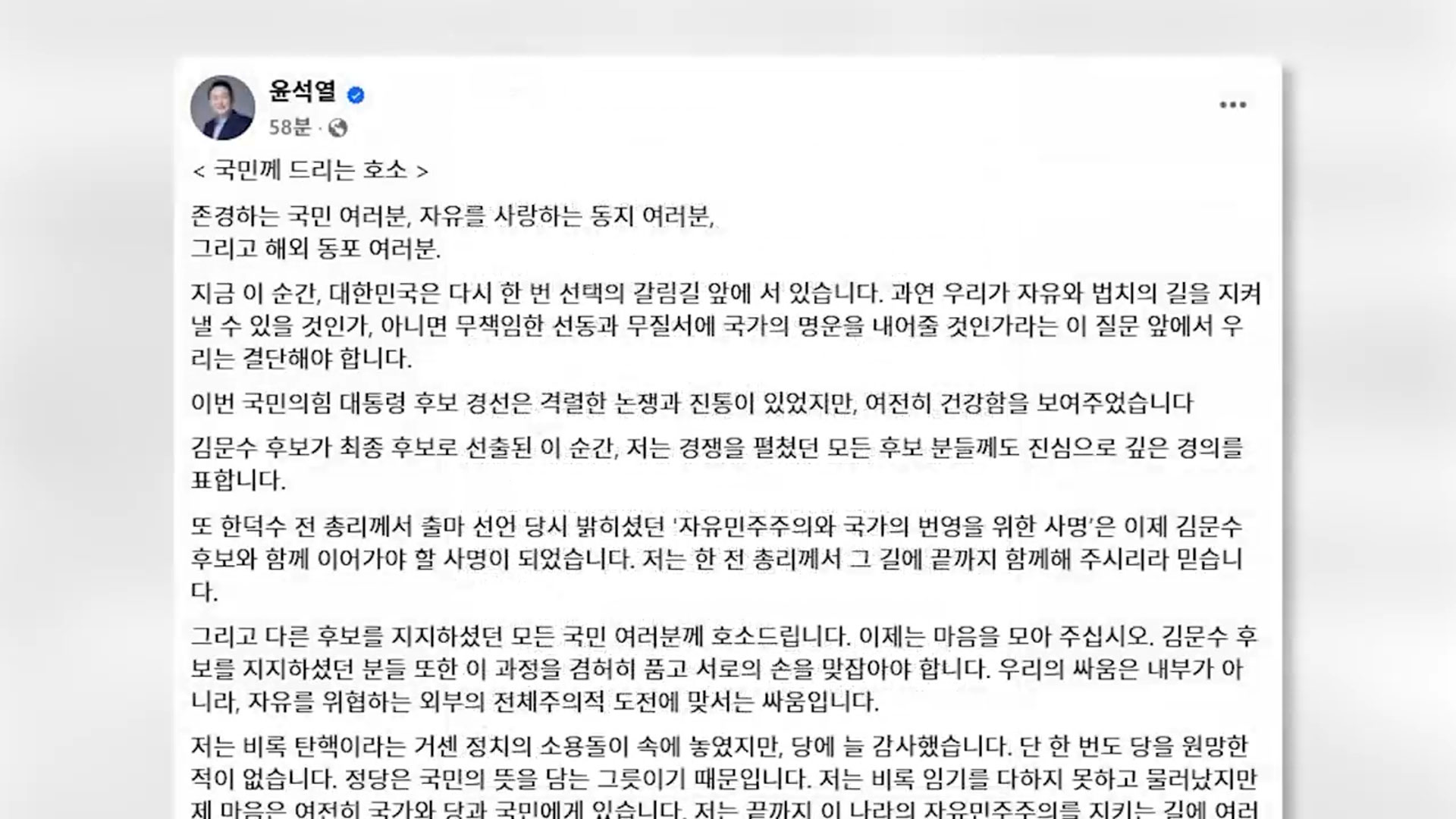 국민의힘 대선후보 최종 확정에 따라 김문수 후보에게 힘을 싣고 지지층 결집을 호소하는 취지로 풀이됩니다.