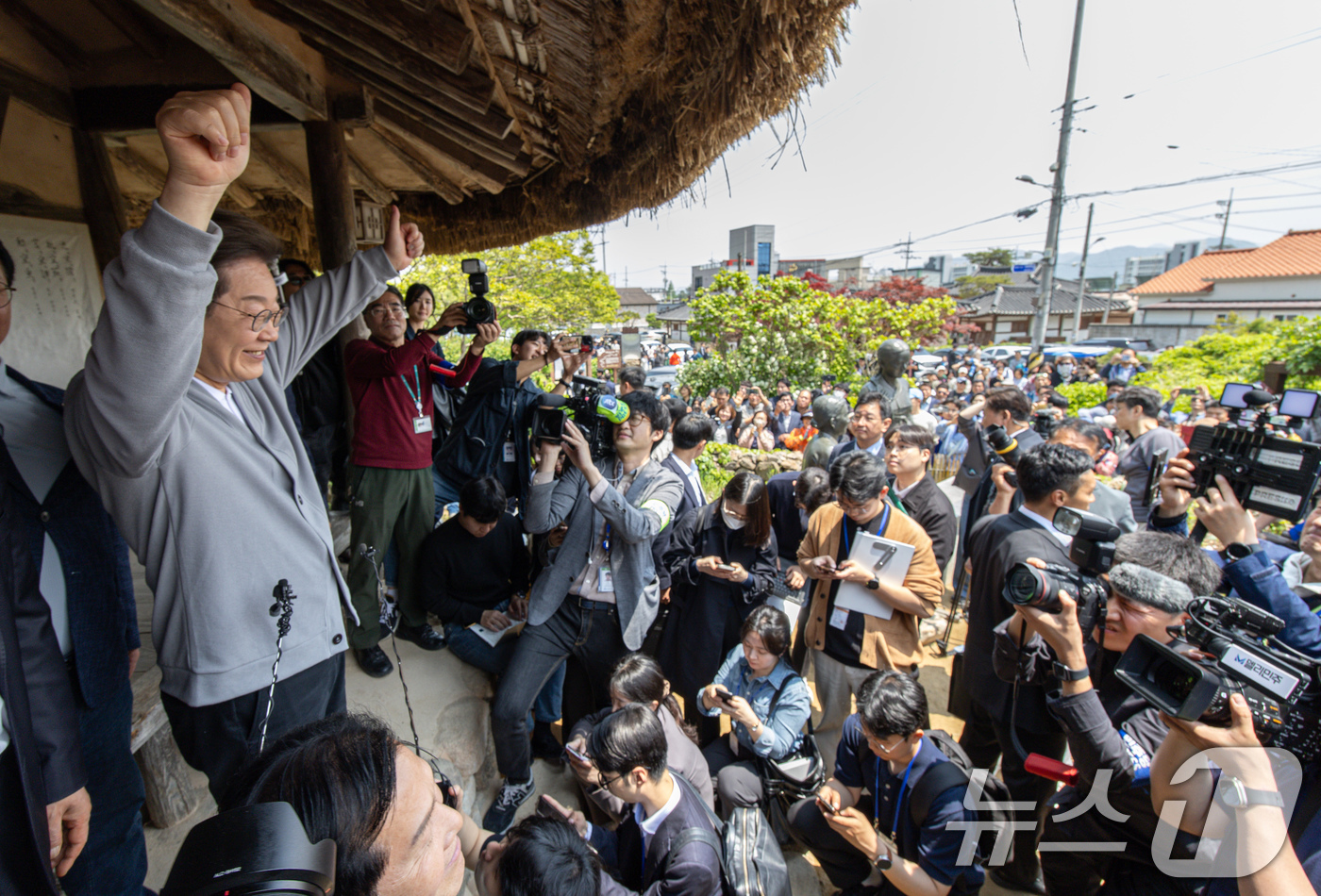 (강진=뉴스1) 이재명 기자 = 경청투어에 나선 이재명 더불어민주당 대통령 후보가 11일 오후 전남 강진군 강진읍 사의재를 찾아 시민들을 향해 인사하고 있다. 2025.5.11/뉴스1