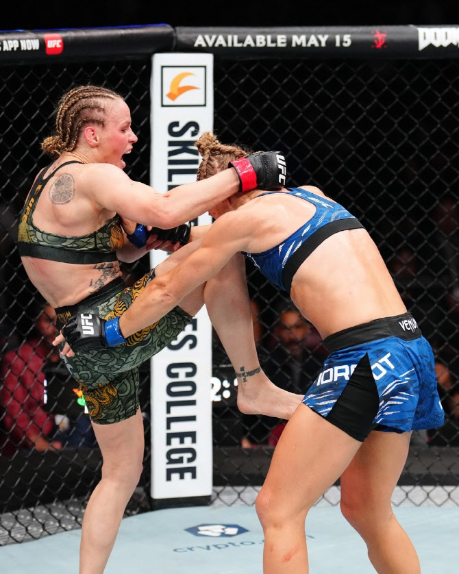 UFC 여성 플라이급 챔피언 발렌티나 셰브첸코가 도전자 마농 피오로에게 강력한 니킥을 선물하고 있다. 사진=UFC |
