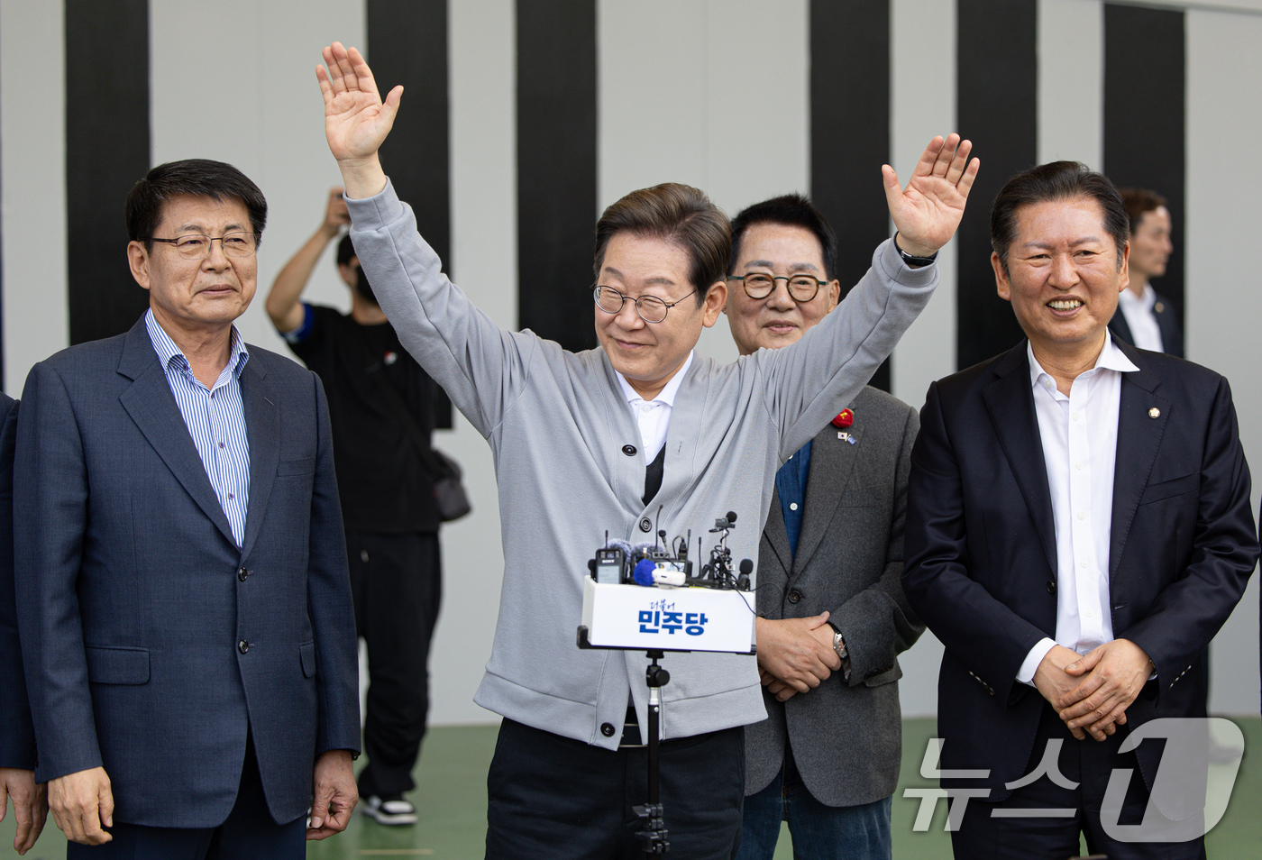 (강진=뉴스1) 이재명 기자 = 경청투어에 나선 이재명 더불어민주당 대통령 후보가 11일 오후 전남 해남군 군민광장 야외공연장에서 두 손을 들어올리고 있다. 2025.5.11/뉴스1