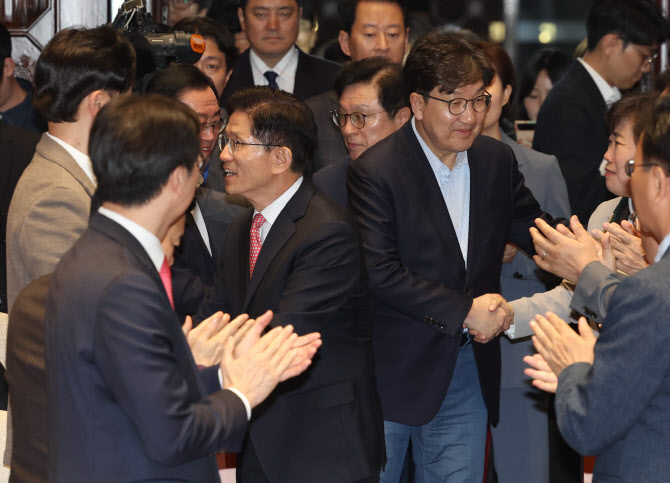 [이데일리 노진환 기자] 김문수 국민의힘 대선 후보와 권성동 원내대표가 11일 오후 서울 여의도 국회에서 열린 의원총회에 참석하며 의원들과 인사하고 있다.