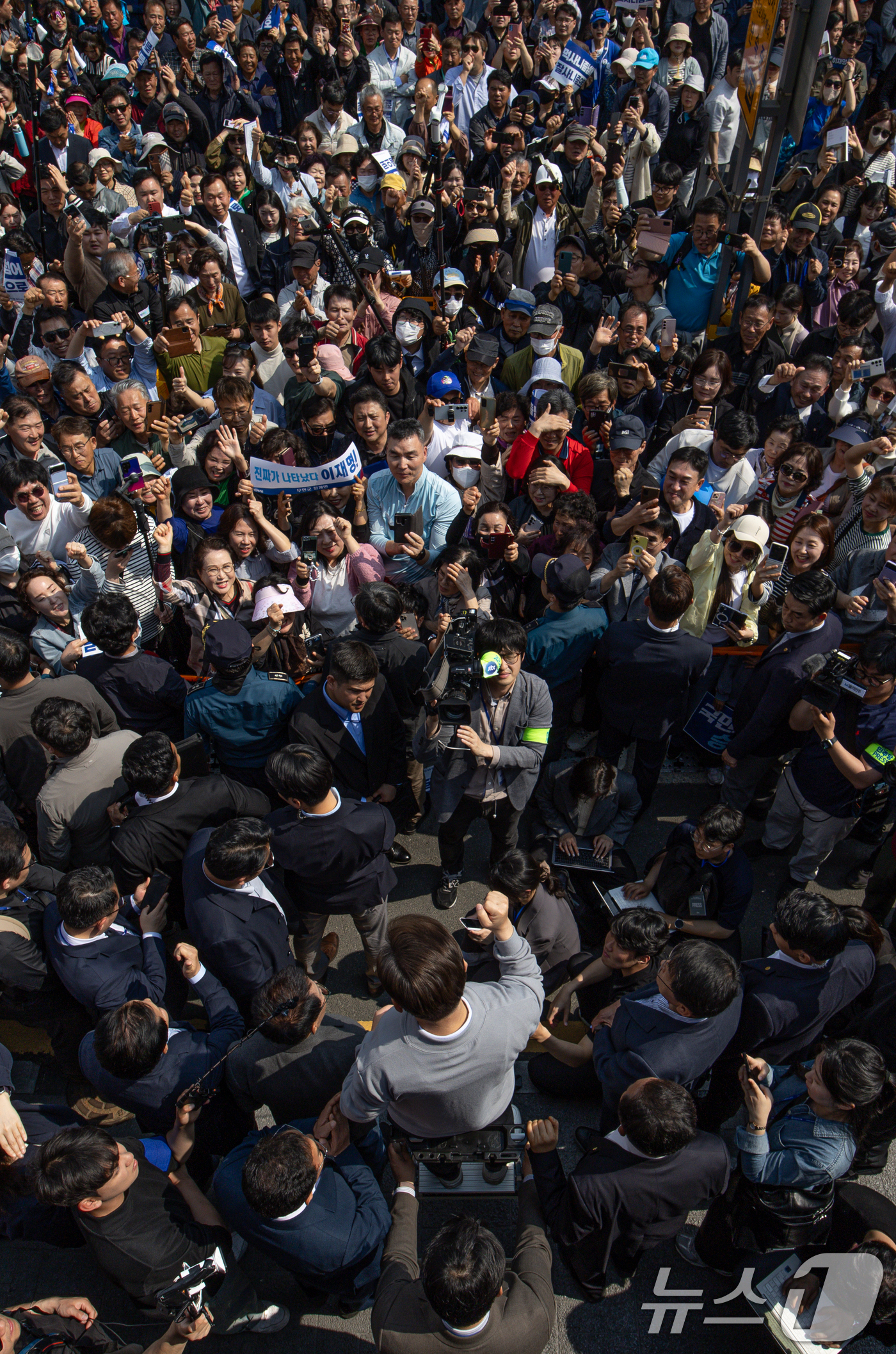 (영암=뉴스1) 이재명 기자 = 경청투어에 나선 이재명 더불어민주당 대통령 후보가 11일 오후 전남 영암군 독천낙지거리에서 연설을 하고 있다. 2025.5.11/뉴스1