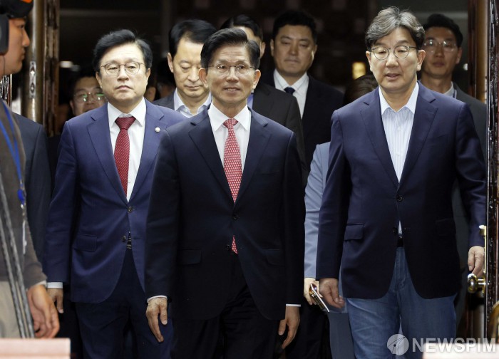 [서울=뉴스핌] 양윤모 기자 = 김문수 국민의힘 대통령선거 후보가 11일 오후 서울 여의도 국회에서 열린 의원총회에 권성동 원내대표와 힘께 참석하고 있다. 2025.05.11 yym58@newspim.com