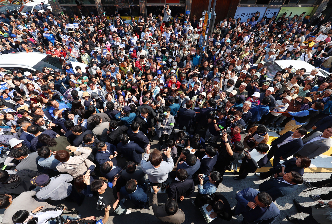 남도문화벨트 골목골목 경청투어에 나선 이재명 더불어민주당 대선 후보가 11일 전남 영암군 학산면 독천낙지거리를 찾아 연설을 하고 있다.[연합] |
