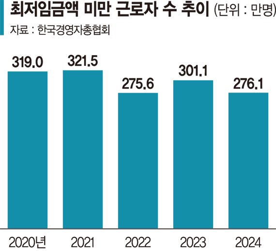지난해 법정 최저임금액인 시급 9860원을 받지 못한 근로자가 276만명에 달하는 것으로 나타났다. 전체 근로자의 12.5%에 달하는 수치다. 물가와 임금 상승률을 뛰어넘는 수준의 최저임금 인상이 지속되면서 노동시장의 수용성이 저하됐다는 지적이 나온다.