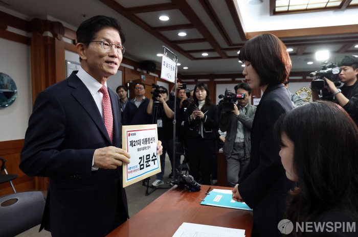 [서울=뉴스핌] 양윤모 기자 = 김문수 국민의힘 대선 후보가 11일 오전 경기 과천 중앙선거관리위원회에서 제21대 대통령 선거 후보자 등록 서류를 제출하고 있다. 국민의힘은 10일 김문수 대선 후보를 한덕수 후보로 교체하는 찬반을 묻는 전 당원 투표를 한 결과, 반대 의견이 찬성보다 많아 부결됐다고 밝혔다. [공동취재] 2025.05.11 yym58@newspim.com |