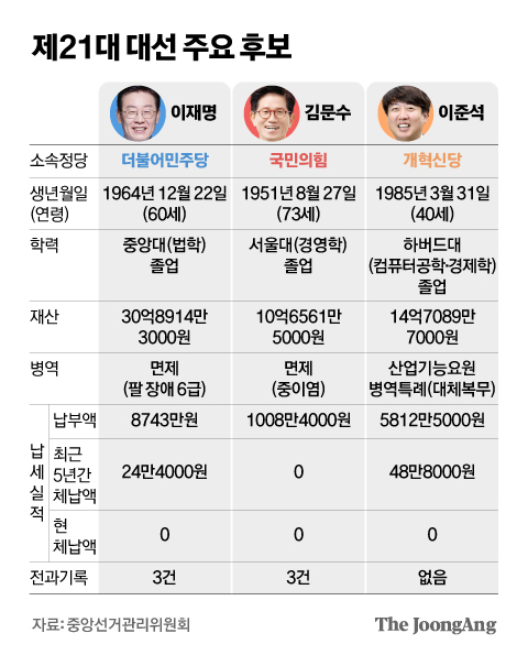 이 후보는 전날 대선후보 등록을 마친 직후엔 인천국제공항에서 미국으로 출국하는 홍준표 전 대구시장을 만났다. 홍 전 시장은 이 후보에게 “이번대선은 이재명 대 이준석 양자구도”라고 덕담했다. 이 후보는 기자들과 만나 “제가 보수 진영 적장자로서 선거를 이겨내고 자유주의·보수주의 가치를 세우겠다”고 말했다.