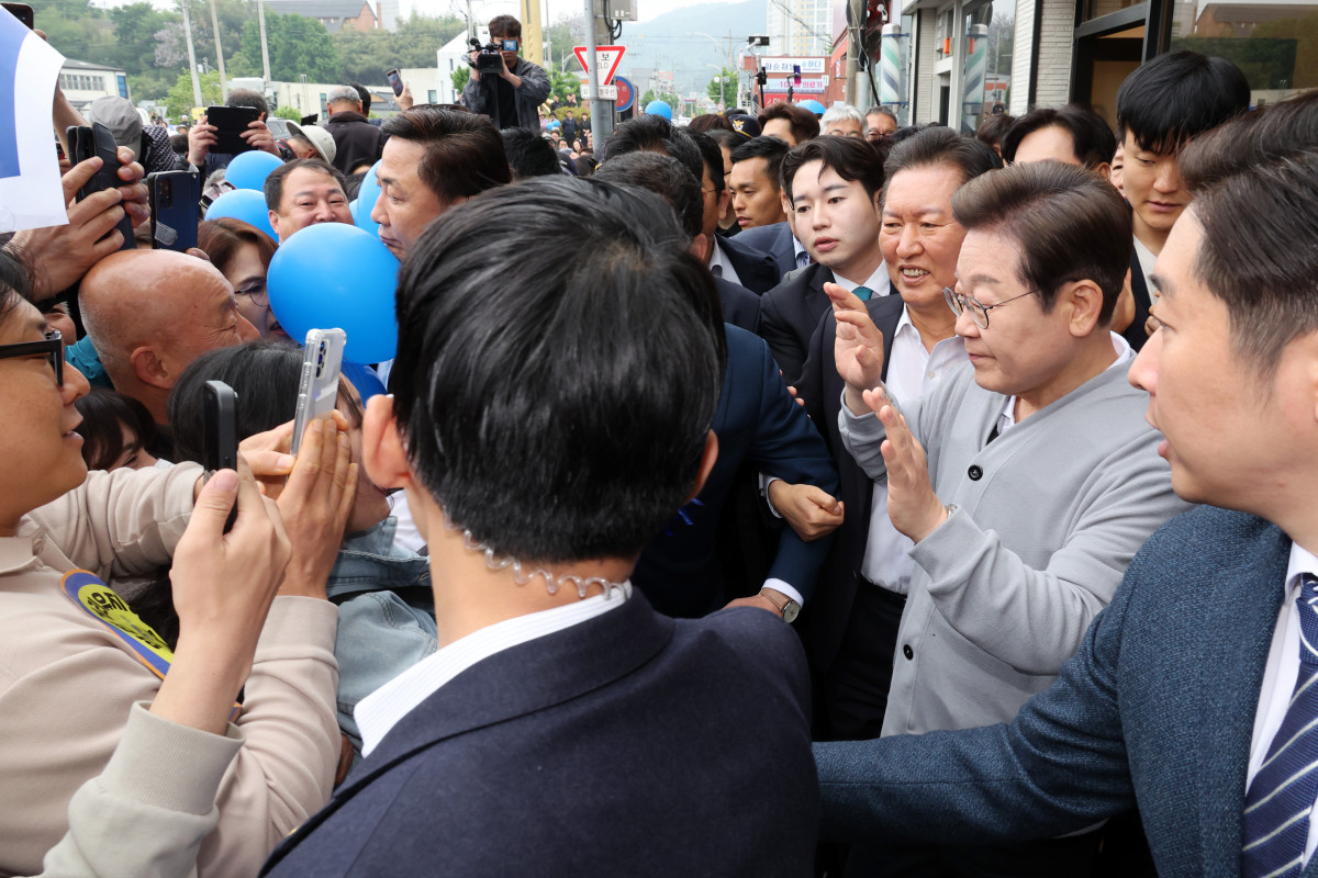 민심을 청취하는 '경청 투어'에 나선 이재명 더불어민주당 대선후보가 11일 전남 화순군 화순읍 인근 거리에서 경호를 받으며 주민들에게 인사하고 있다. |
