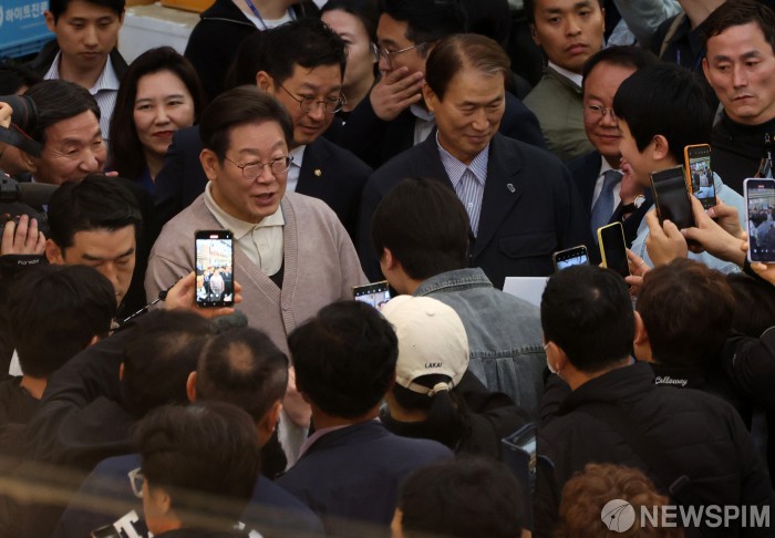 [성주=뉴스핌] 최지환 기자 = '골목골목 경청투어'에 나선 이재명 더불어민주당 대선후보가 9일 오후 경북 성주군 성주전통시장에서 시민들과 인사하고 있다. 2025.05.09 choipix16@newspim.com |