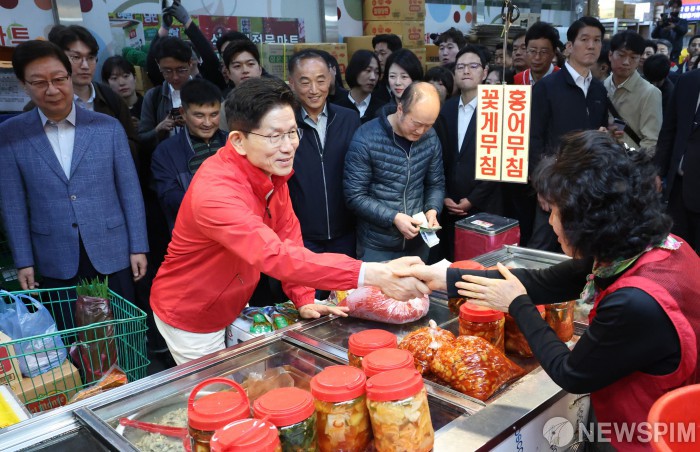 [서울=뉴스핌] 이호형 기자 = 김문수 국민의힘 대선 후보가 제21대 대통령선거 공식 선거운동 첫날인 12일 오전, 서울 송파구 가락시장을 찾아 상인들과 인사를 하고 있다. 2025.05.12 leemario@newspim.com |