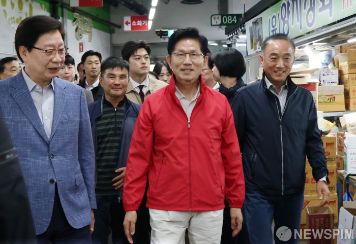 [서울=뉴스핌] 이호형 기자 = 김문수 국민의힘 대선 후보가 제21대 대통령선거 공식 선거운동 첫날인 12일 오전, 서울 송파구 가락시장을 찾아 상인회장의 안내를 받으며 유세 하고 있다. 2025.05.12 leemario@newspim.com