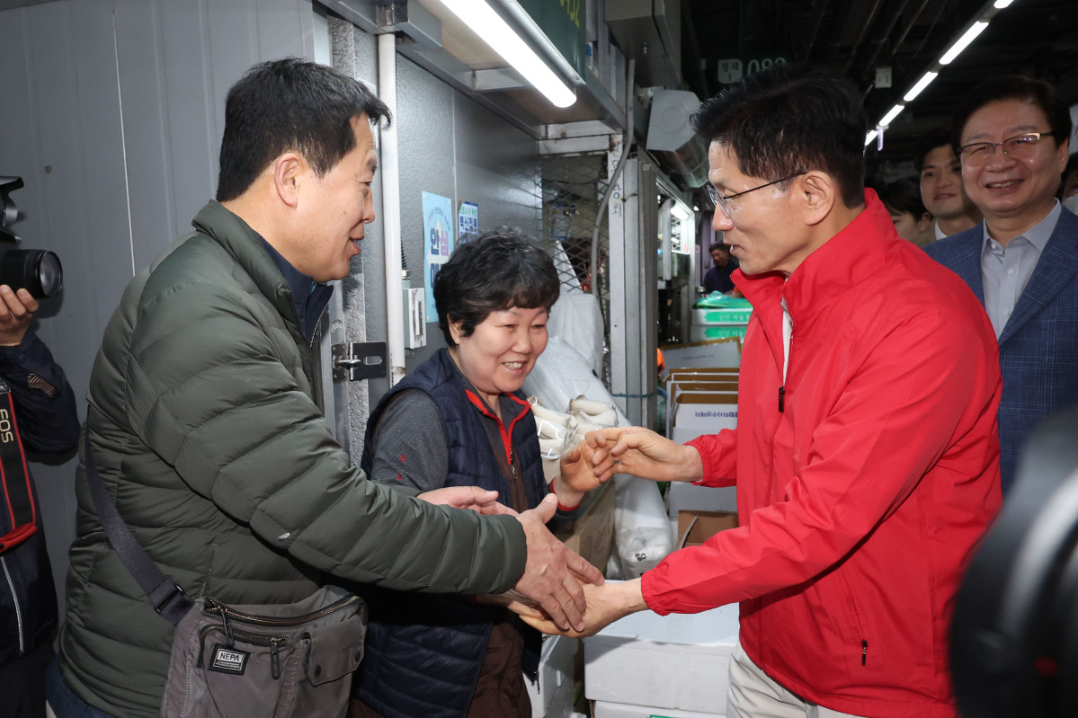 시장을 둘러본 뒤 기자들과 만난 김 후보는 “이곳에서 오늘 우리 경제 민생이 얼마나 어려운지, 삶이 얼마나 힘든지 느낀다”라며 “지금 대한민국 경제가 장기 구조적 침체되어 있고 그 여파로 소상공인, 자영업자가 어려운 현실을 이곳이 잘 보여준다”라고 말했다.