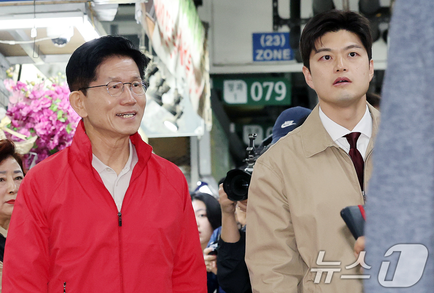 (서울=뉴스1) 이동해 기자 = 제21대 대통령 선거 공식 선거운동이 시작된 12일 오전 김문수 국민의힘 대선 후보와 당 신임 비상대책위원장으로 내정된 김용태 의원이 서울 송파구 양재대로 가락시장을 방문해 상인들과 인사를 나누고 있다. 2025.5.12/뉴스1