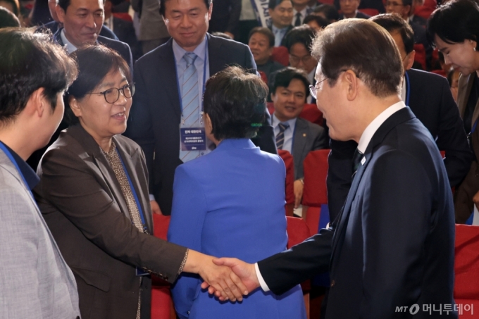 [서울=뉴시스] 조성우 기자 = 이재명 더불어민주당 대선후보가 30일 오후 서울 여의도 국회 의원회관에서 열린 더불어민주당 제21대 대통령선거 '진짜 대한민국' 중앙선거대책위원회 출범식에서 정은경 총괄선대위원장과 인사하고 있다. 2025.04.30. xconfind@newsis.com /사진=조성우 |