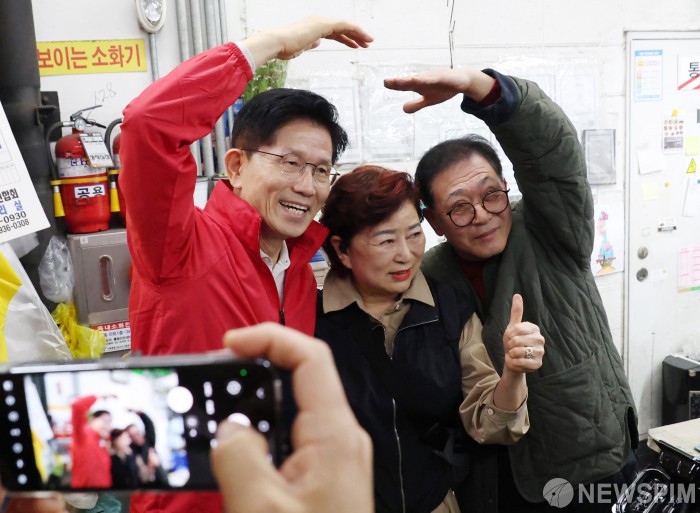 [서울=뉴스핌] 이호형 기자 = 김문수 국민의힘 대선 후보가 제21대 대통령선거 공식 선거운동 첫날인 12일 오전, 서울 송파구 가락시장을 찾아 상인들과 기념촬영을 하고 있다. 2025.05.12 leemario@newspim.com