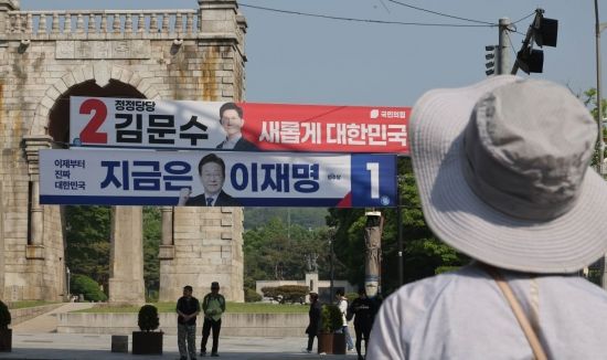 제21대 대통령선거 공식 선거운동 첫날인 12일 서울 서대문구 독립문 앞에 더불어민주당 이재명 후보와 국민의힘 김문수 후보의 현수막이 걸려 있다.