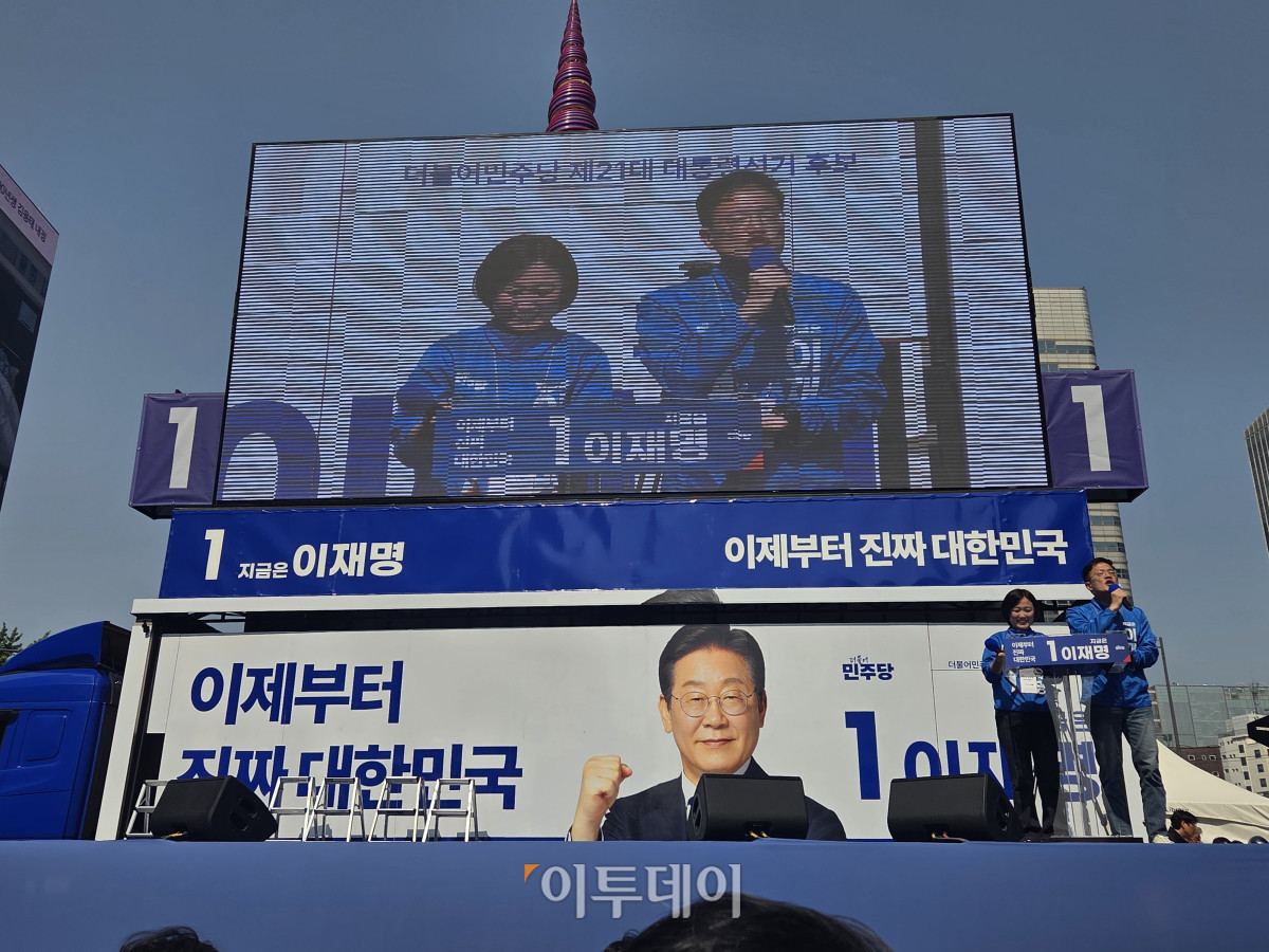 더불어민주당이 제21대 대선 공식 선거운동 기간이 시작된 12일 서울 광화문에서 출정식을 가지는 모습 |