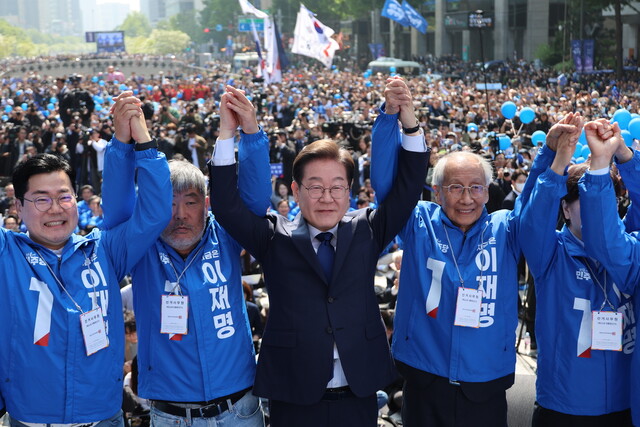 이재명 더불어민주당 대통령 후보(가운데)와 박찬대·윤여준 상임 총괄선대위원장을 비롯한 선대위원장들이 6·3 대통령선거 공식 선거운동 첫날인 12일 서울 청계광장에서 열린 중앙선거대책위원회 출정식에서 두 팔을 들어 올리며 시민들에게 인사하고 있다. 연합뉴스 |