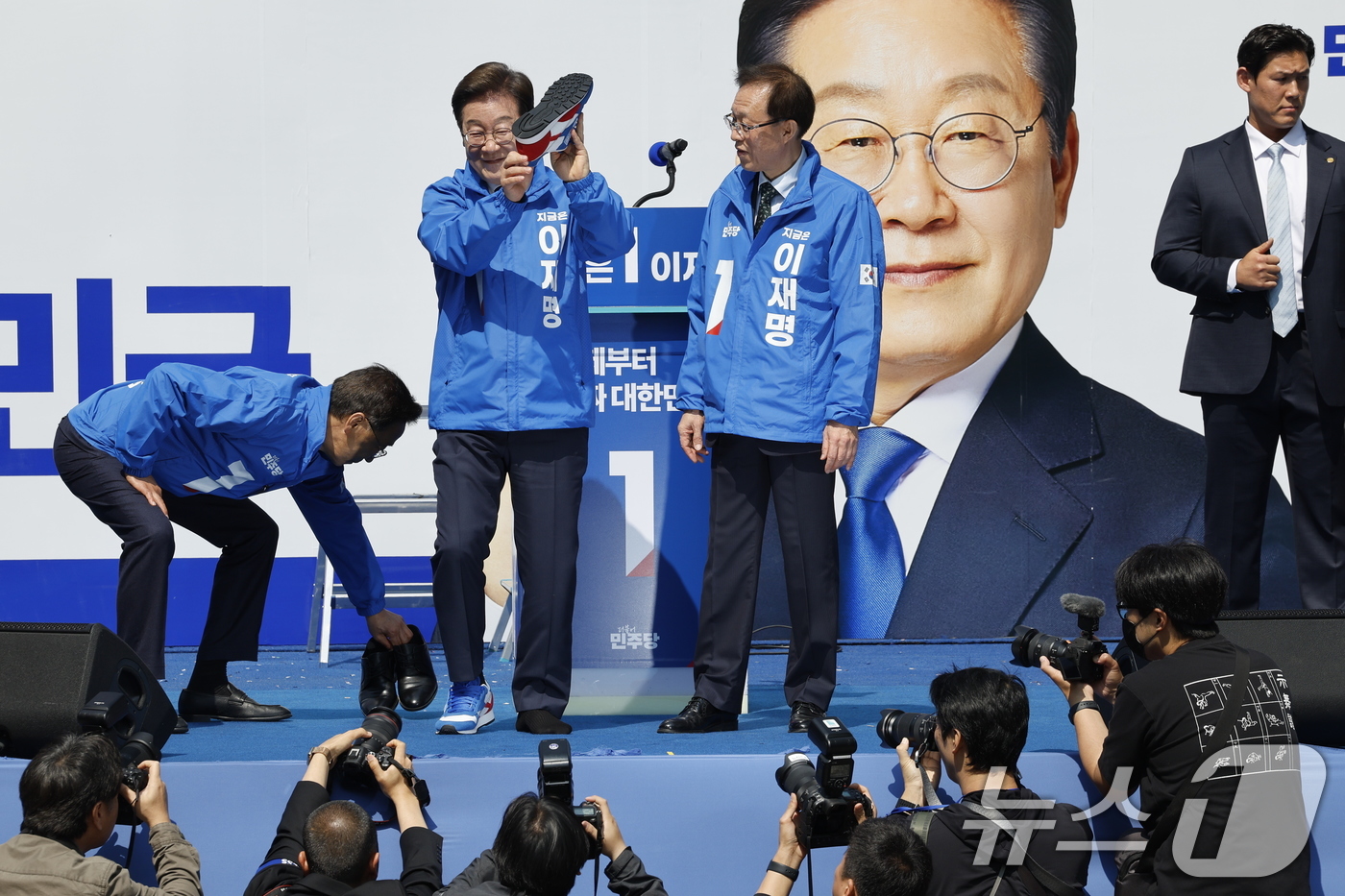 (서울=뉴스1) 안은나 기자 = 이재명 더불어민주당 대통령 후보가 12일 오전 서울 종로구 청계광장에서 열린 중앙선거대책위원회 출정식에서 구두를 벗고 운동화를 신고 있다. 2025.5.12/뉴스1