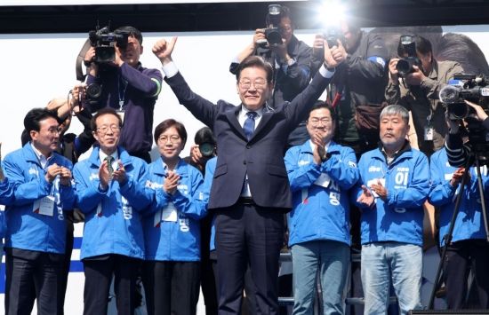 이재명 더불어민주당 대선 후보가 제21대 대통령선거 공식 선거운동 첫날인 12일 '빛의 혁명'을 상징하는 공간인 서울 광화문 청계광장에서 첫 유세를 시작하며 두 팔을 번쩍 들고 있다.