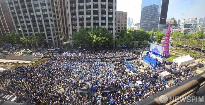 [서울=뉴스핌] 정일구 기자 = 대통령 선거운동 첫날인 12일 오전 서울 종로구 청계광장에 많은 더불어민주당원과 지지자들이 운집했다. 2025.05.12 mironj19@newspim.com