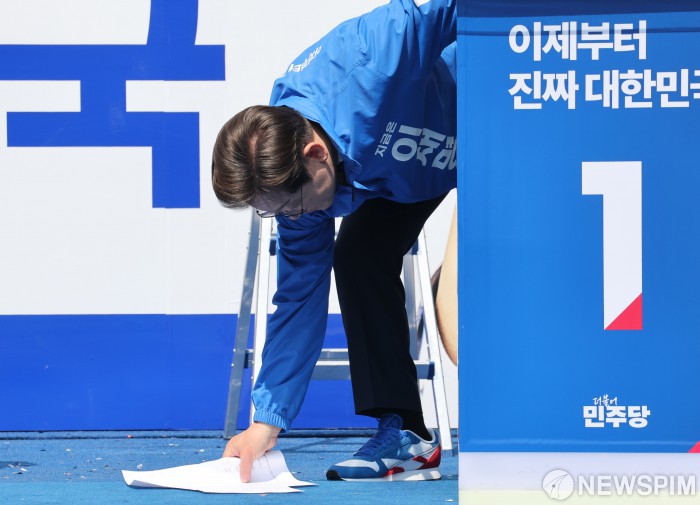 [서울=뉴스핌] 정일구 기자 = 이재명 더불어민주당 대선 후보가 6·3 대통령선거 공식 선거운동 첫날인 12일 서울 광화문 청계광장에서 열린 출정식 및 첫 유세에서 후보 연설문이 바람에 날리자 연설문을 줍고 있다. 2025.05.12 mironj19@newspim.com |